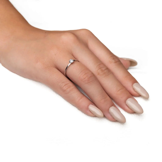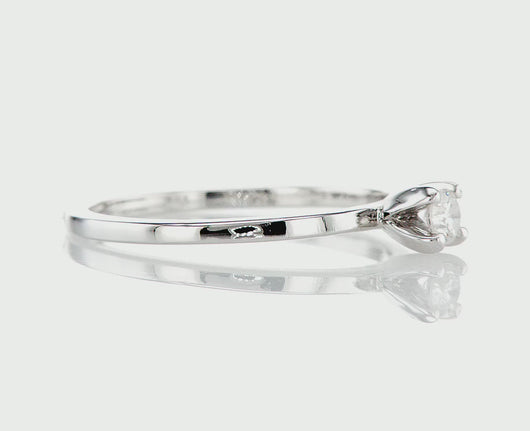 טבעת אירוסין זו היא יצירת אומנות עדינה, שנוצרה עם תשומת לב לכל הפרטים הקטנים. משובצת במרכזה יהלום טבעי שמניח עליה אור חי ובהיר. העיצוב הנקי והאלגנטי שלה משרה אווירה של רומנטיקה בלתי נשכחת.