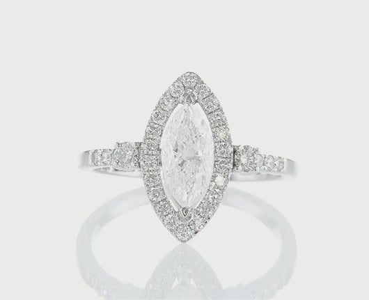 טבעת מדהימה משובצת ביהלום טבעי גדול בליטוש מרקיזה וכתר יהלומים מסביבה