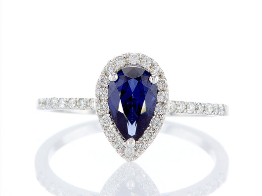 טבעת מעוצבת ועדינה המשלבת אבן חן ספיר בליטוש בצורת טיפה, מוקפת בכתר של יהלומים טבעיים. הטבעת המרשימה הזו משלבת את היוקרה והברק של טבעת יהלומים עם הייחודיות והעדינות של אבן חן ספיר, ומציעה אלגנטיות ויופי בלתי רשמי