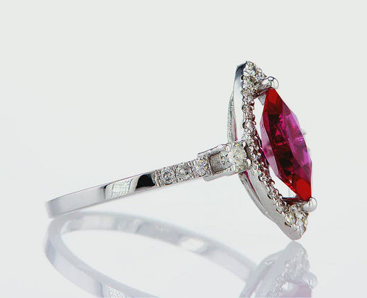 טבעת משובצת באבן חן בליטוש מרקיזה ומוקפת בכתר של יהלומים טבעיים ביהלומים