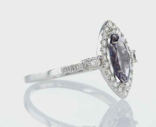 טבעת משובצת באבן חן בליטוש מרקיזה ומוקפת בכתר של יהלומים טבעיים
