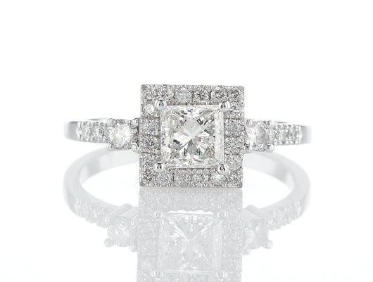 טבעת סופר אלגנטית עם אבן מרכזית מרובעת מוקפת ביהלומים בצורת ריבוע