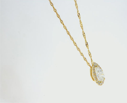 תליון עם יהלום טבעי גדול בליטוש טיפה ומסביבו יהלומים ושרשרת זהב